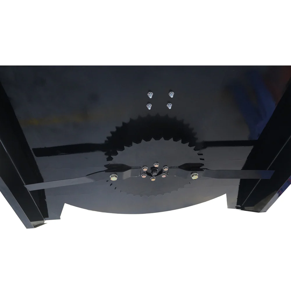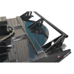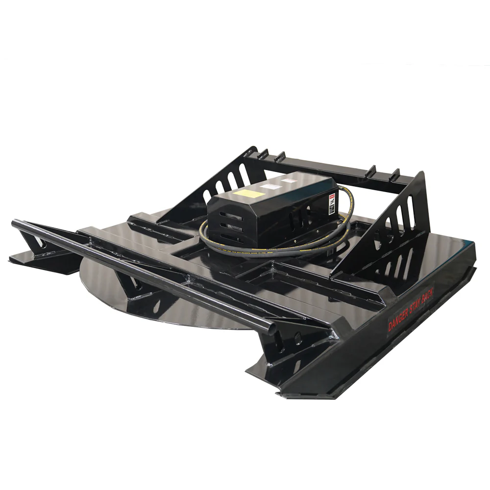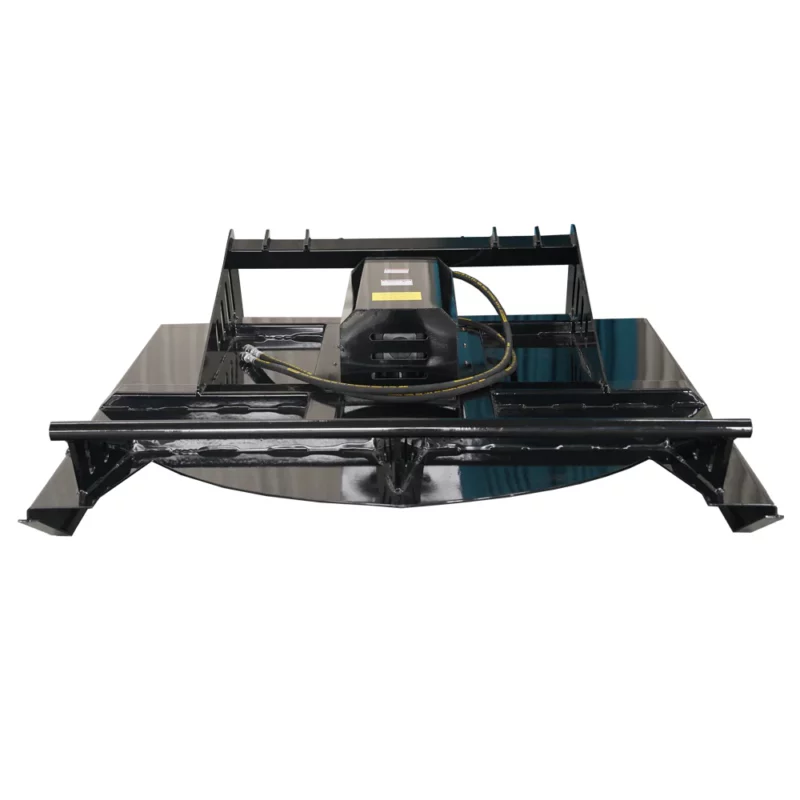 The power is supplied by hydraulic direct drive motor with check value relief and allows machines without a high flow option to be compatible with 15 to 20 GPM. Gear bo turns the blades at around 1060 RPM’s with 20 GPM flow, for a very efficient cut. The deck is equipped with a stump jumper between the blades and the deck, to help ride over obstacles like stumps. A safety chain in back, to limit the height your deck can be raised.