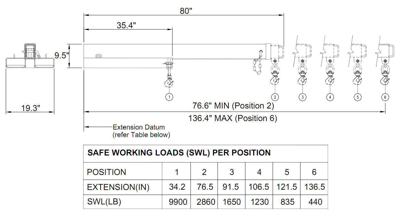 This 9900lb long jib is a general purpose jib which is great for reaching across pits and areas where the forklift cant drive up to as it has a 137.8” reach when fully extended.Overall length when closed is 78”.